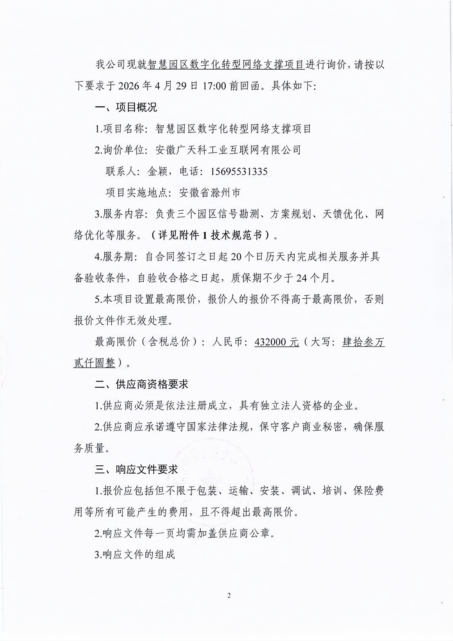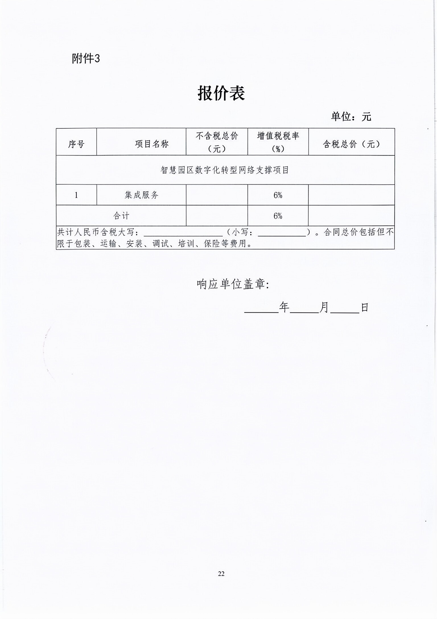 智慧园区数字化转型网络支撑项目询价函
